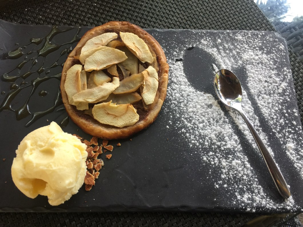 Next, I used the Ride app to get to my hotel. After checking in (and reserving a seat on the shuttle bus to the airport for tomorrow) I walked around, printed my boarding pass, and sat by the pool, with a cold one. The cold one was an apple tart with ice cream.