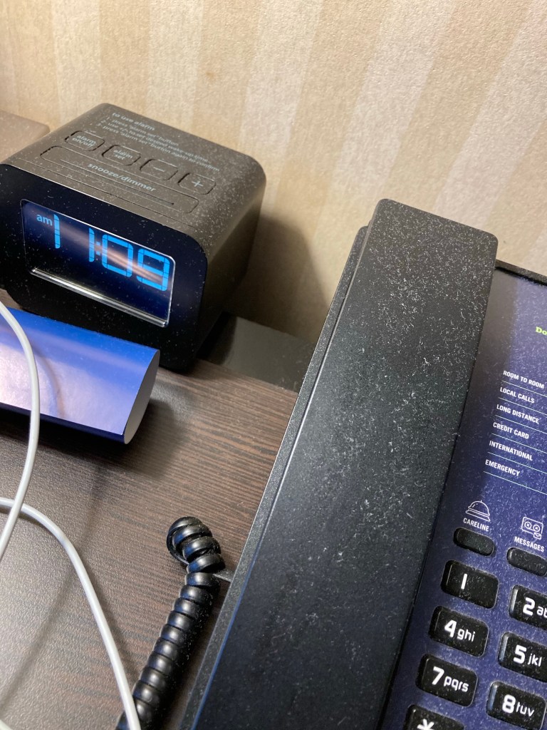 A young man was at the door. “Are you smoking in your room?” He asked. I told him no. “If you’re smoking in your room, you need to tell me.” He continued. I explained, again, that I’m a non smoker. The guy was standing by a cart of dirty bedding. He took a step towards me. I shut that down! “You can report me if you want!” He called out as my door was closing.
