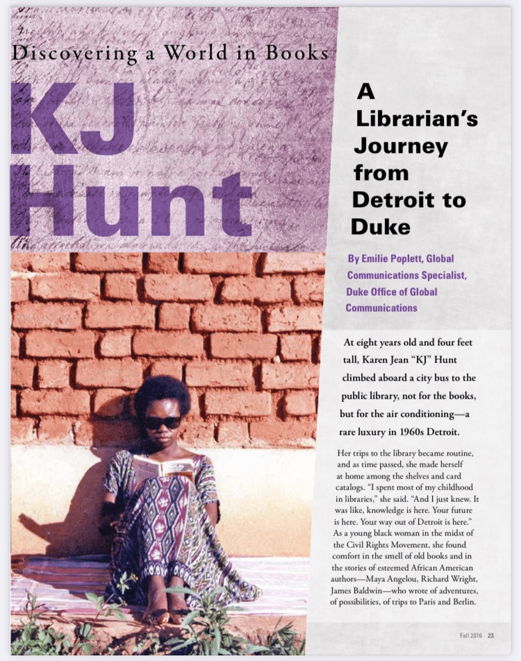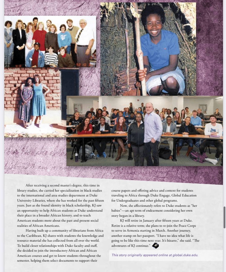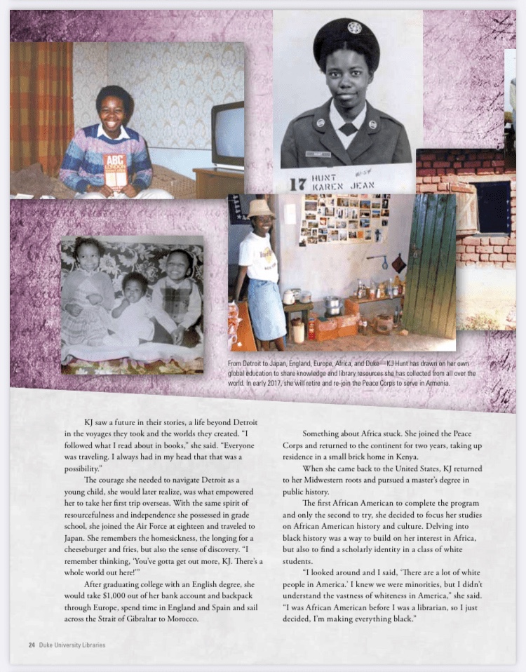 This article was published the fall, before my retirement, in February 2017. The photo of me is from my 1974 high school graduation, in Detroit.I served in Peace Corps Kenya in the 1980s.These photos include my first trip to London, in 1984, basic training at Lackland Air Force Base, in 1975, one of my only baby pictures (I’m in the middle), and my Peace Corps house in Kenya.Photos include my International Librarianship class (at the University of Michigan), in 1992, the front of my Peace Corps house in Kenya, inside an old Kenyan traditional home, and being the Course Librarian (a role I created) for the African and African American Studies Department at Duke University.
