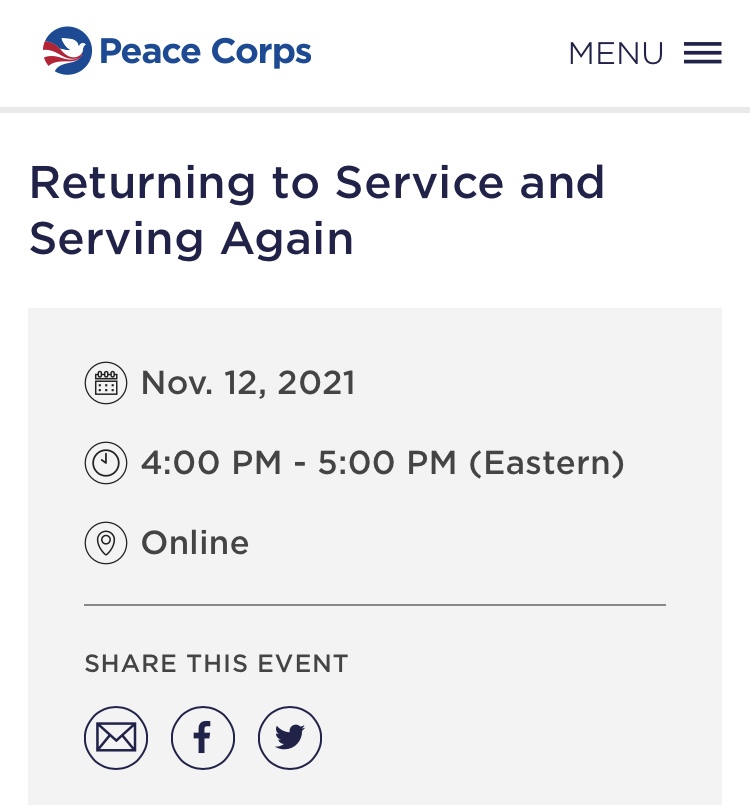 November 9, 2021November 9, 2021 ghettogirltravels Quick Note I’m doing a Peace Corps event this Friday, November 12th. https://www.peacecorps.gov/events/ Sign up today Share this:Share Click to print (Opens in new window) Print Click to email a link to a friend (Opens in new window) Email Like Loading...