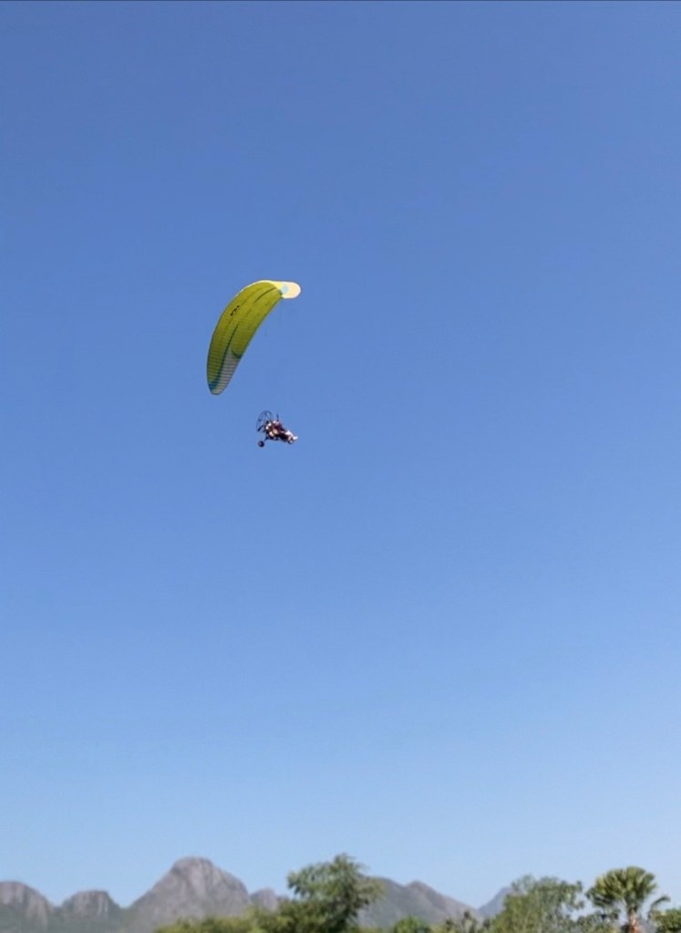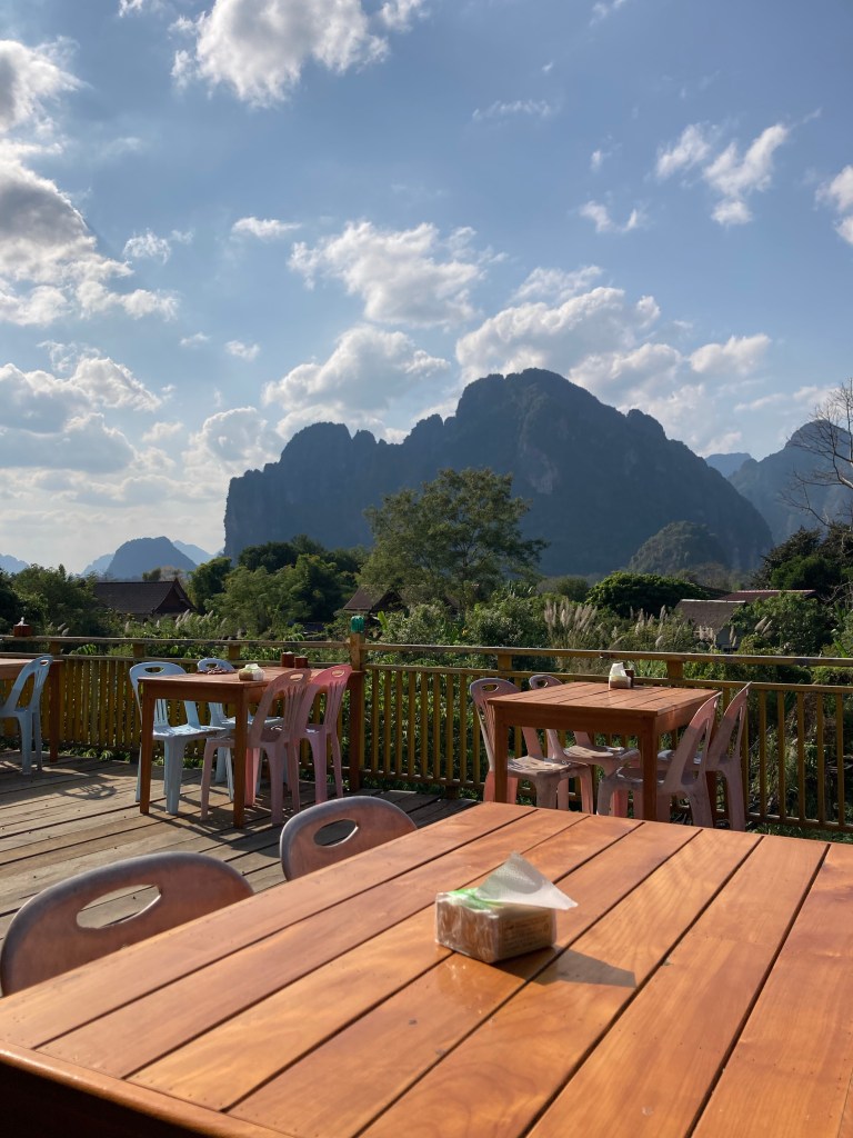 Here’s a quick update! I took the new high speed train from Vientiane to Vang Vieng. My hotel is on the north end of town. So far, all I’ve done is hang out at Green Restaurant. The views are amazing and you never know who’s going to be flying by! I’ll post more later! XOXO — GGT