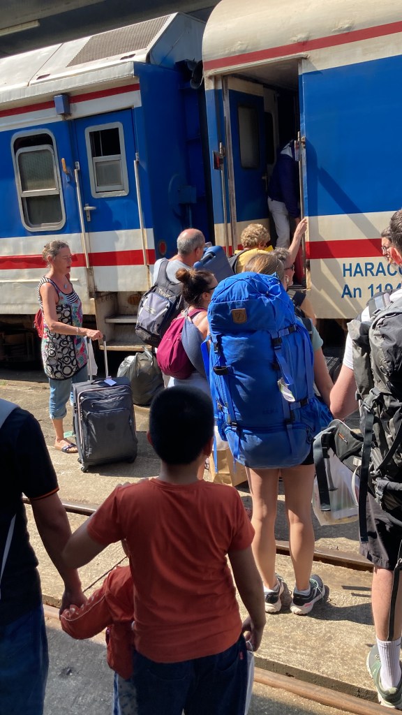 There could only be one way to leave Da Nang, the place that I’ve heard about all of my life. I booked a seventeen hour sleeper train and hopped up onto the top bunk of my four person sleeping berth. And, before you ask, no, the bed linen was not changed between passengers. I was the only person going from Da Nang to Ho Chi Minh. Each time someone in my berth exited the train, the attendant came in and refolded the bedding. Luckily, I packed a silk Cocoon sleeping liner that I got from REI. At some point, during the trip, I followed my upper bunk mate and handed over money for tea. Tea turned out to be the dinner service. I had been warned via YouTube that the food on the train wasn’t safe. As a three time RPCV (Returned Peace Corps Volunteer) I ate what I was served. You have no idea what I ate in Kenya, Armenia, and Ethiopia. Heck, I don’t even know what I ate.