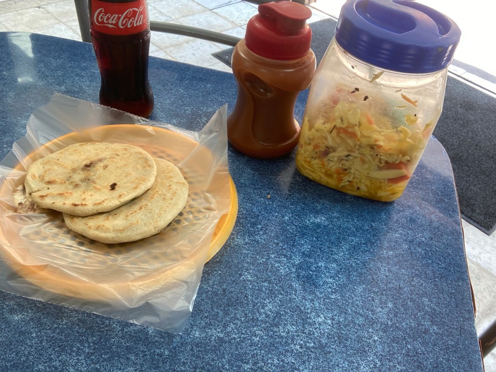I basically got out of the Uber and walked half a block, then turned left. A man was outside a restaurant, directing people to go inside. There were two women making pupusas, in the front archway! I immediately went in and ordered. Never would I ever have believed that I would eat a pupusas, while singing “Dream Weaver” by Gary Wright, in San Salvador.