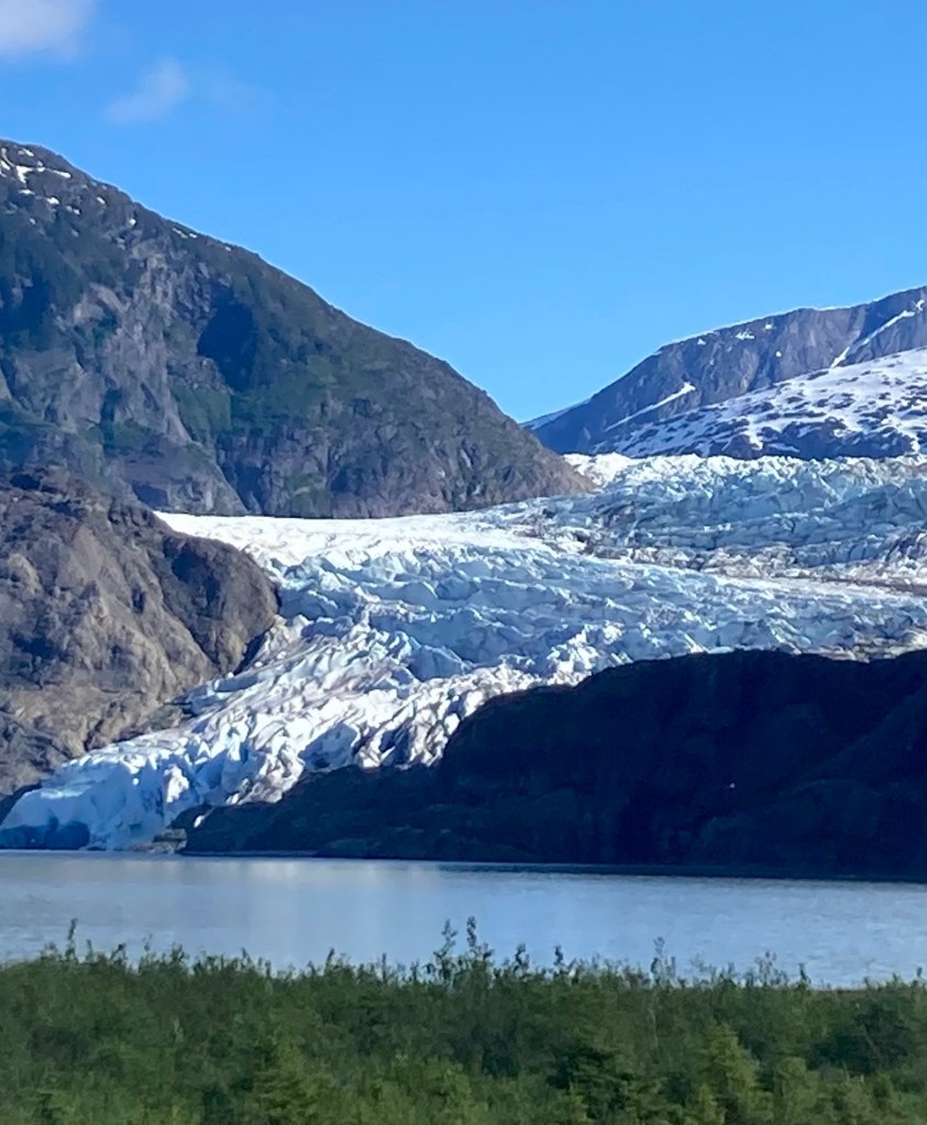 The next day, we arrived in Juneau. I had flown there, on my way to and from Sitka, but had never left the airport. So, for my first visit, I booked the Mendenhall Glacier tour. There’s not a lot of glacier to be seen, from the first view point. I didn’t bother walking down to the waterfall. I was just happy to find the elevator to the visitor center, as my sore knee was bothering me. I watched the free film about the glacier, then made my way back to the bus pickup location.