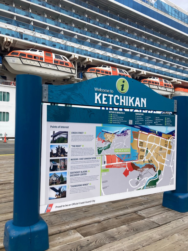 Like Juneau, I had only ever flown in and out of Ketchikan. I booked an excursion that took me into the city center, by boat. Unlike other cruise ships, Norwegian Cruise Lines docks 30 minutes away from town. There’s a gift shop, between the ship and the free shuttle service into town. The small boat taking me there was parked in front of the cruise ship. Once on board, our small group was offered free hot beverages and donuts. The trip was only one way. We were dropped off at Pier One, near the lumberjack show. I skipped it and walked to Pier Four, to catch the shuttle back to the ship.